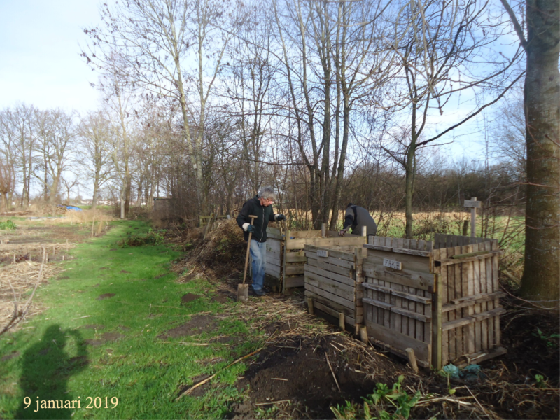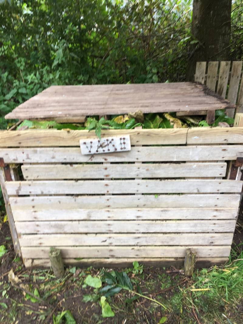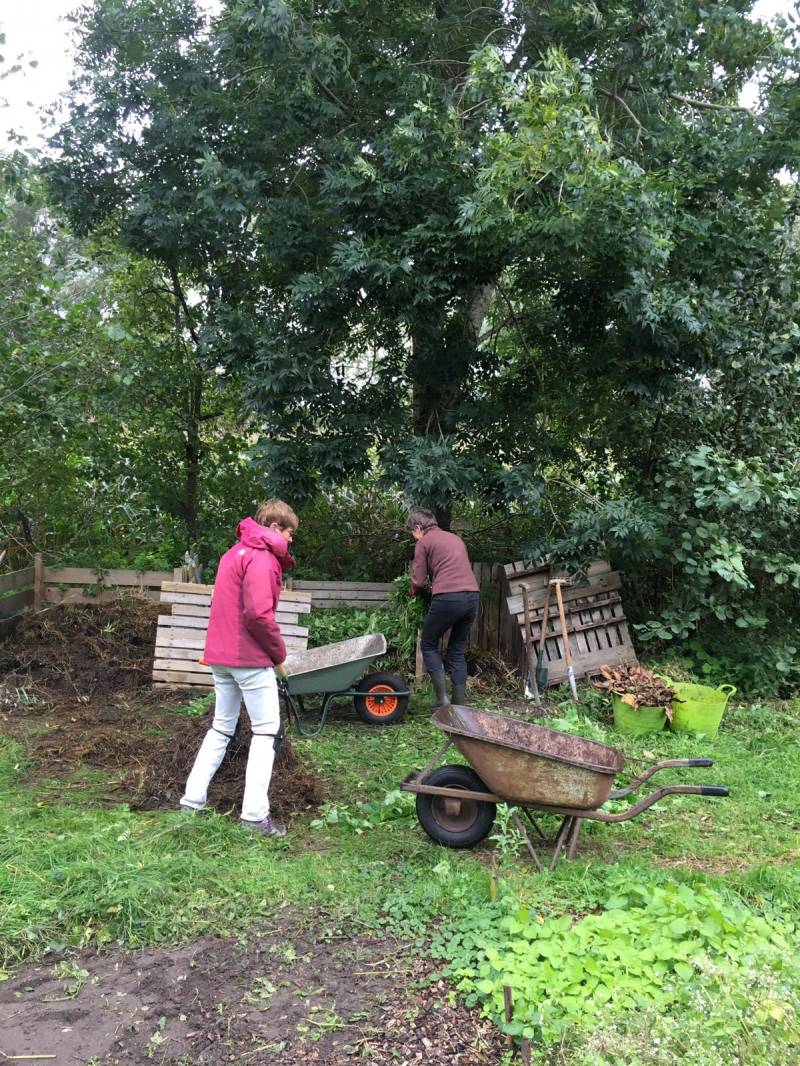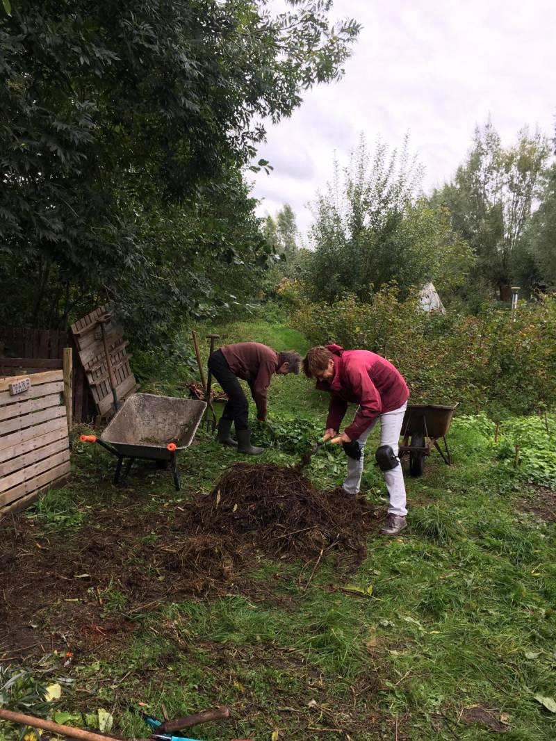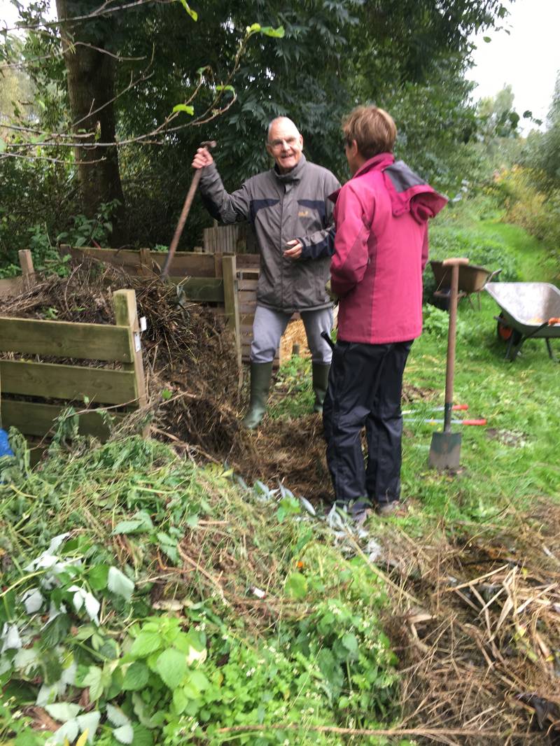 11 oktober 2019 de compostbak is gevuld - groen en bruin verzamelen, klein maken en samen met al wat langer liggend materiaal netjes om en om in laagjes in de bak doen (Ad was er ook bij)