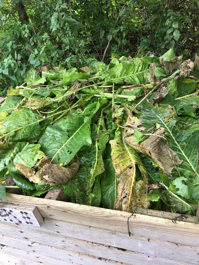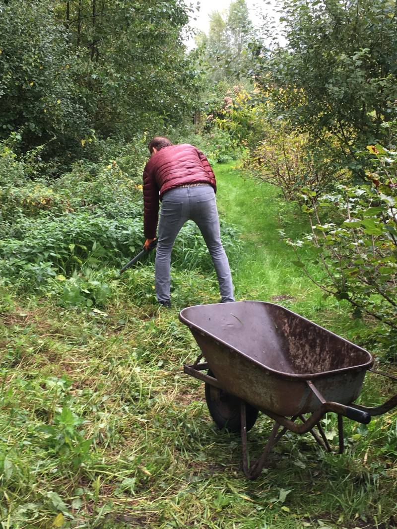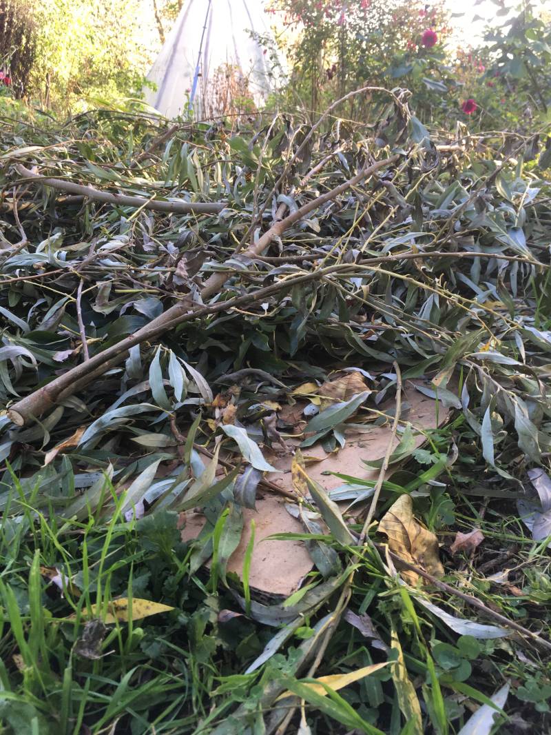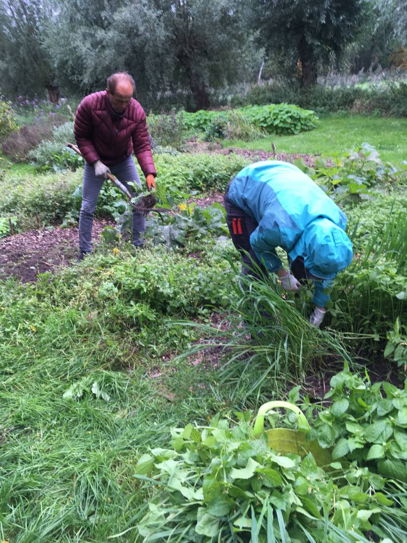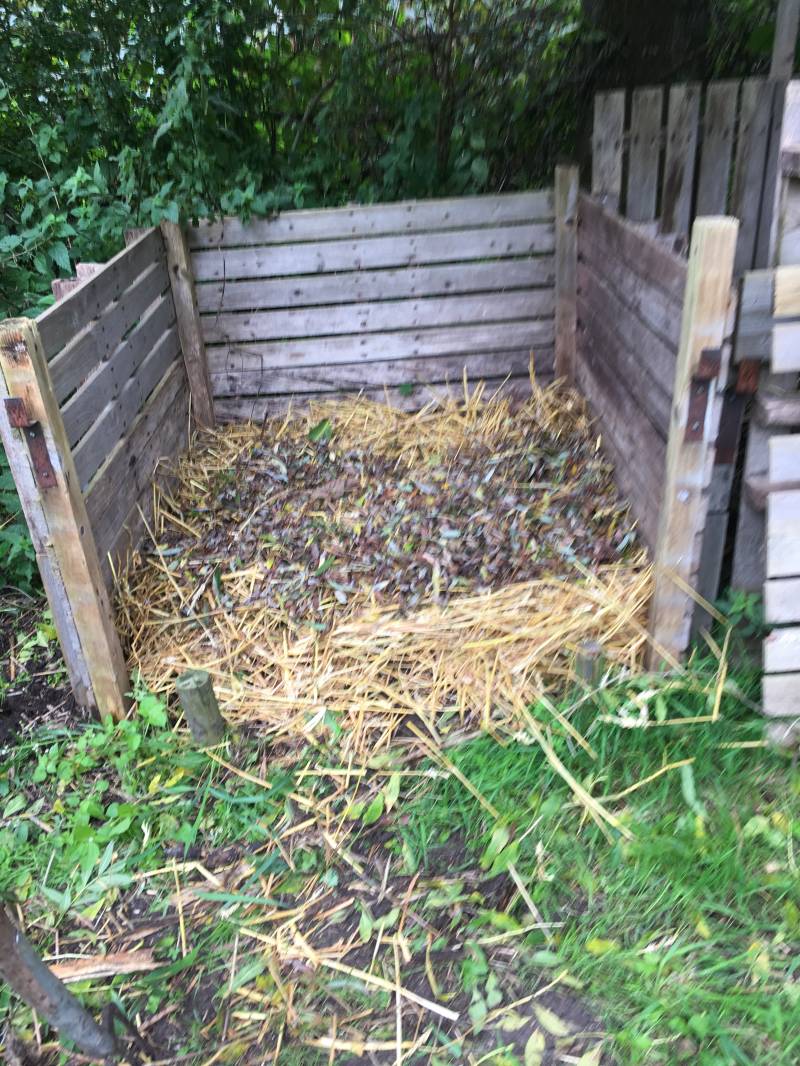11 oktober 2019 de compostbak is gevuld - groen en bruin verzamelen, klein maken en samen met al wat langer liggend materiaal netjes om en om in laagjes in de bak doen (Ad was er ook bij)