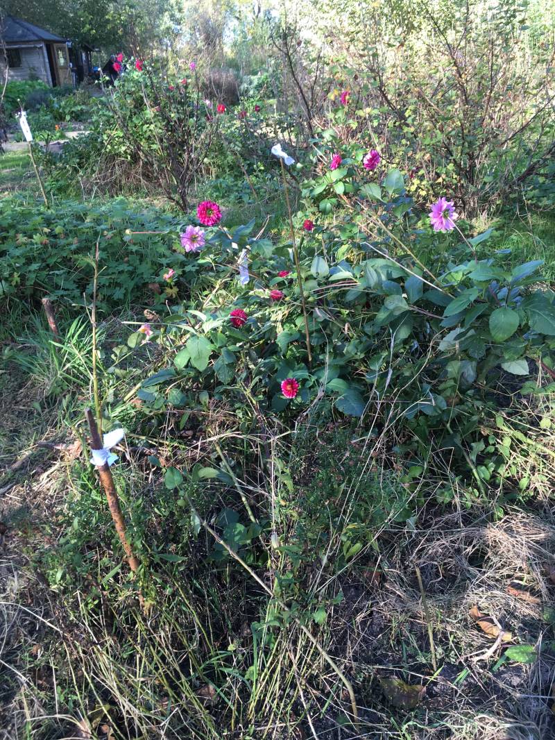 de dahlia's staan nog steeds mooi te bloeien, de witte lintjes dragen de naam van de plant zodat we ze kunnen herkennen als ze uitgebloeid zijn;