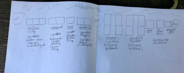 Er is een begin gemaakt om de compost, tuinafval, riet, takken etc op een ander manier in te richten. We gaan het op een andere manier groeperen. Hiermee hopen we meer duidelijkheid te krijgen waar wat moet komen te liggen of ingegooid moet worden. Voor de compost hopen we dit op een makkelijkere manier te kunnen bewerken/onderhouden. Zie op de afbeelding een ruwe schets.