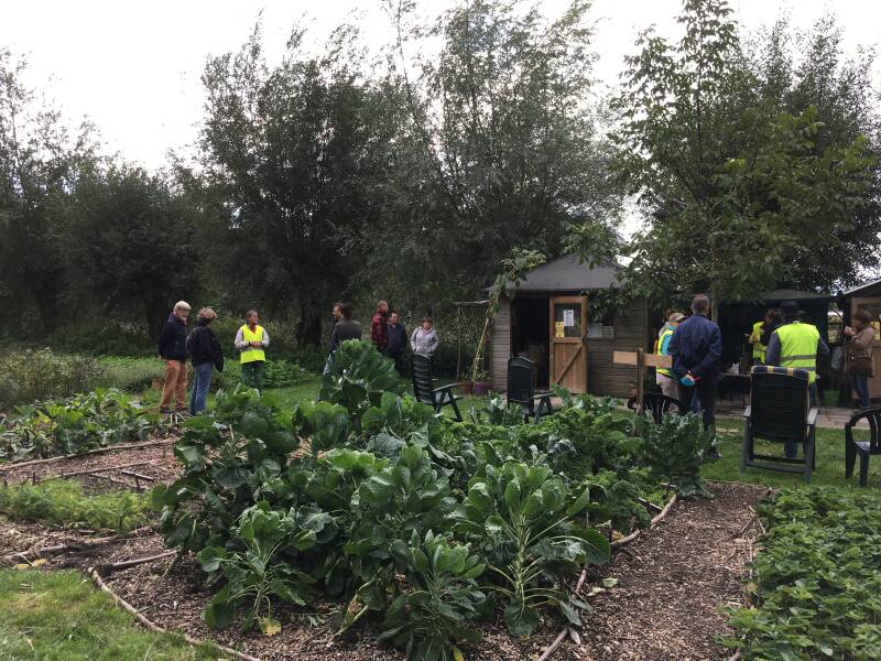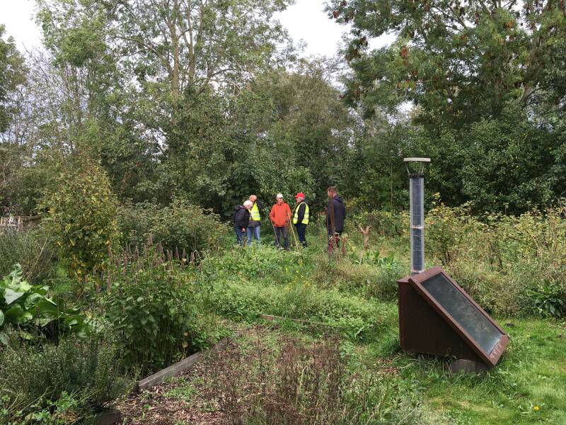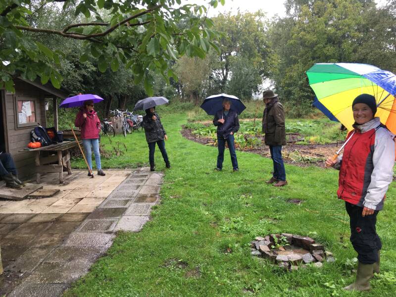 tuinvergadering, het regent en ja, we moeten natuurlijk wel buiten en op afstand blijven; alleen onze notulist mag 'binnen' zitten, je ziet nog net zijn voeten links op de foto