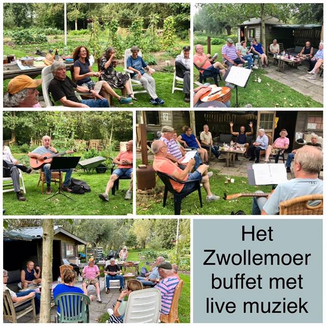 Dan is het na een dag hard werken goed toeven tijdens Het Zwollemoer buffet. Iedereen had zijn best gedaan om wat lekkers te maken van de gewassen uit onze samentuin. De tafels stond goed vol met diversen lekkernijen. Ook de live muziek met bekende nummers die we mee konden zingen was top.